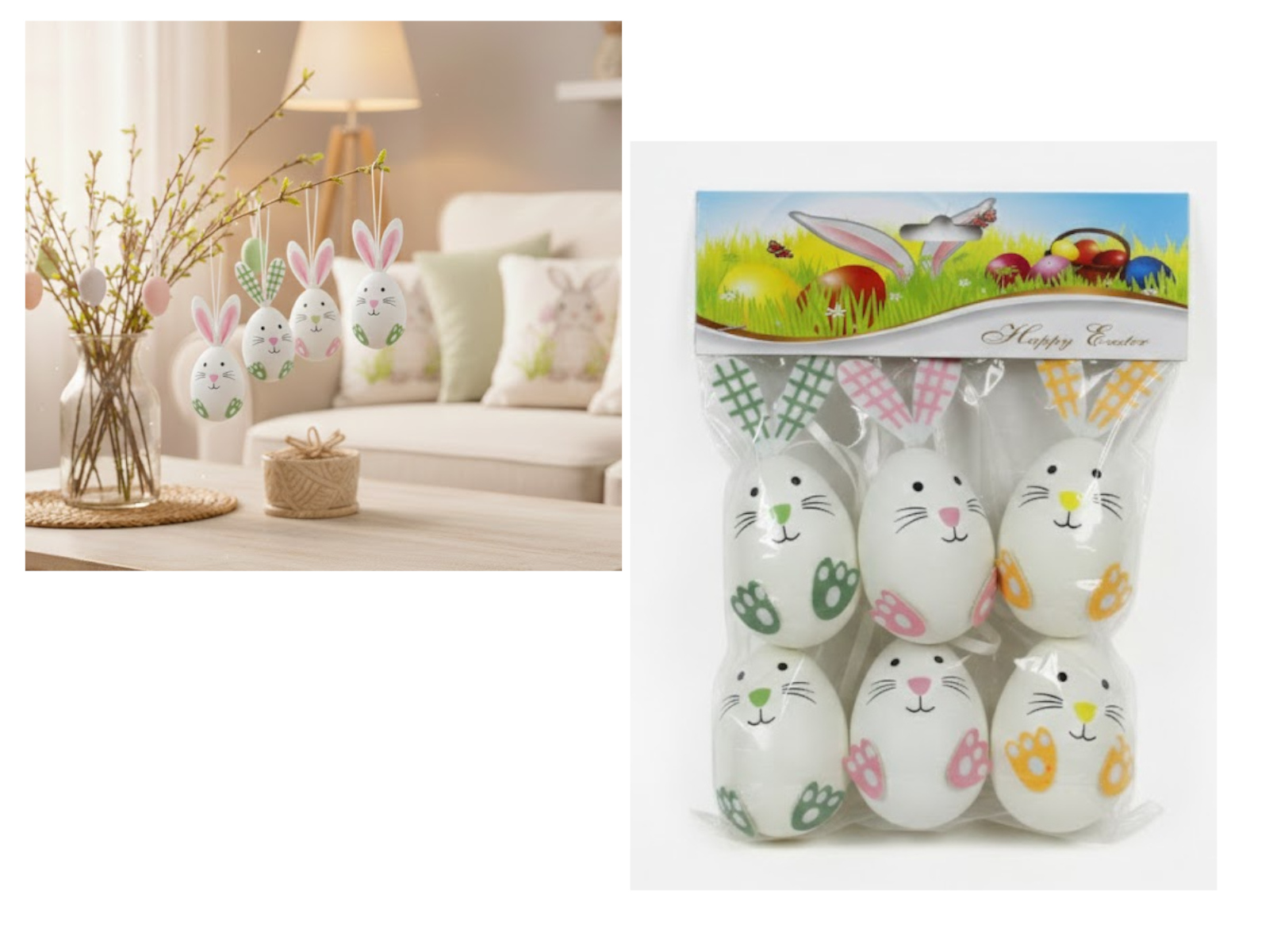 Dekoracja zawieszka wielkanocna JAJKO 6 cm kpl. białe ZAJĄC kpl 6 szt