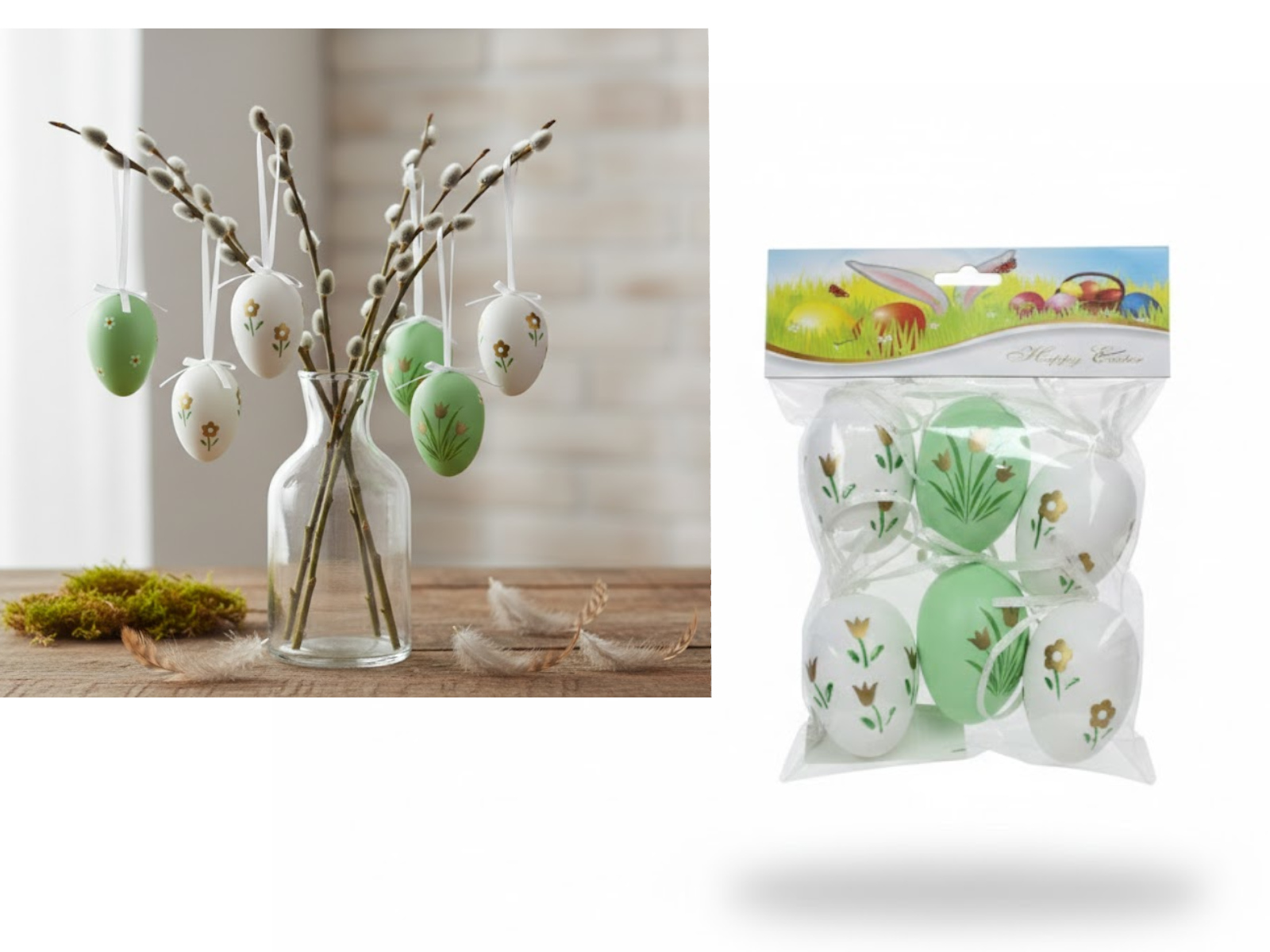 Dekoracja zawieszka wielkanocna JAJKO 6 cm białe, zielone W KWIATY kpl. 6 szt