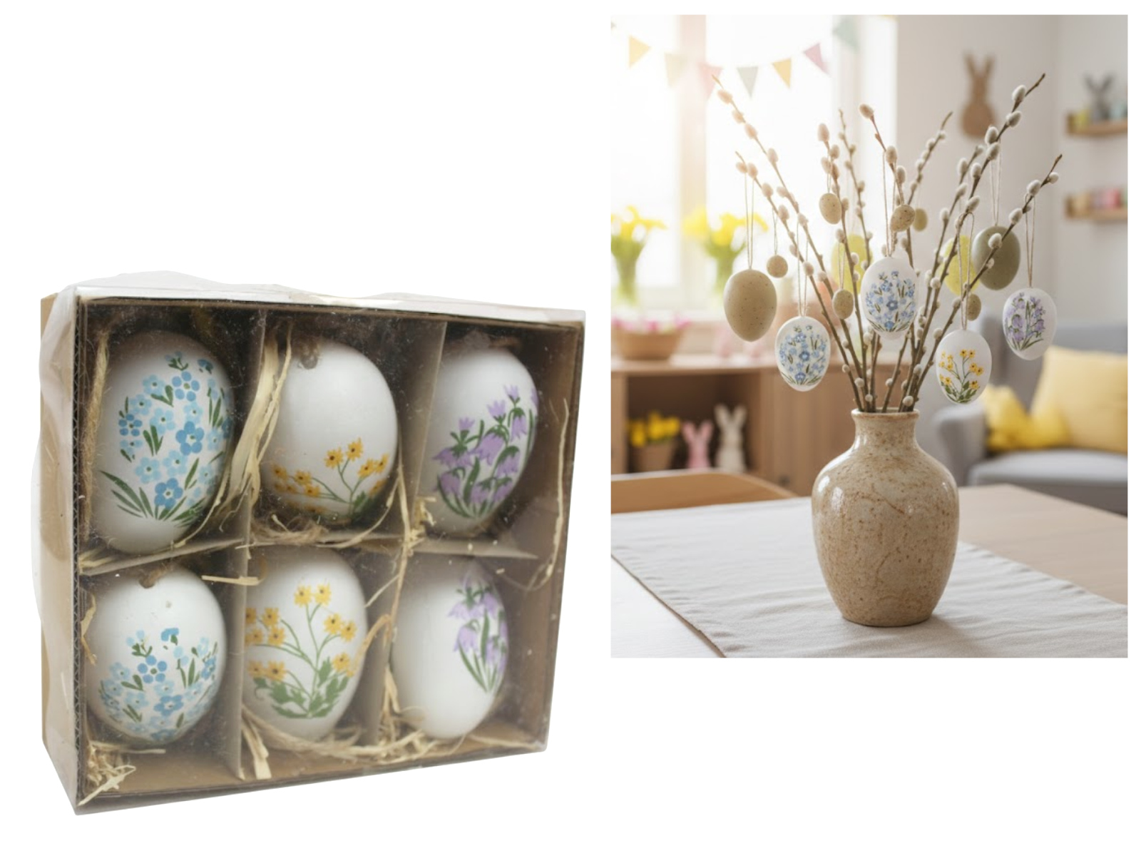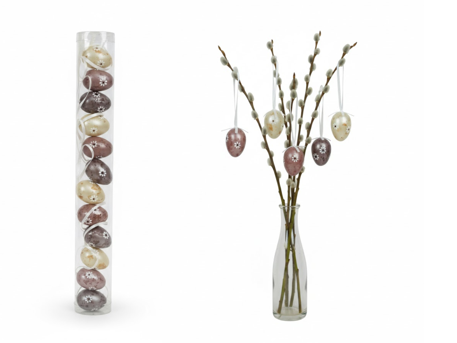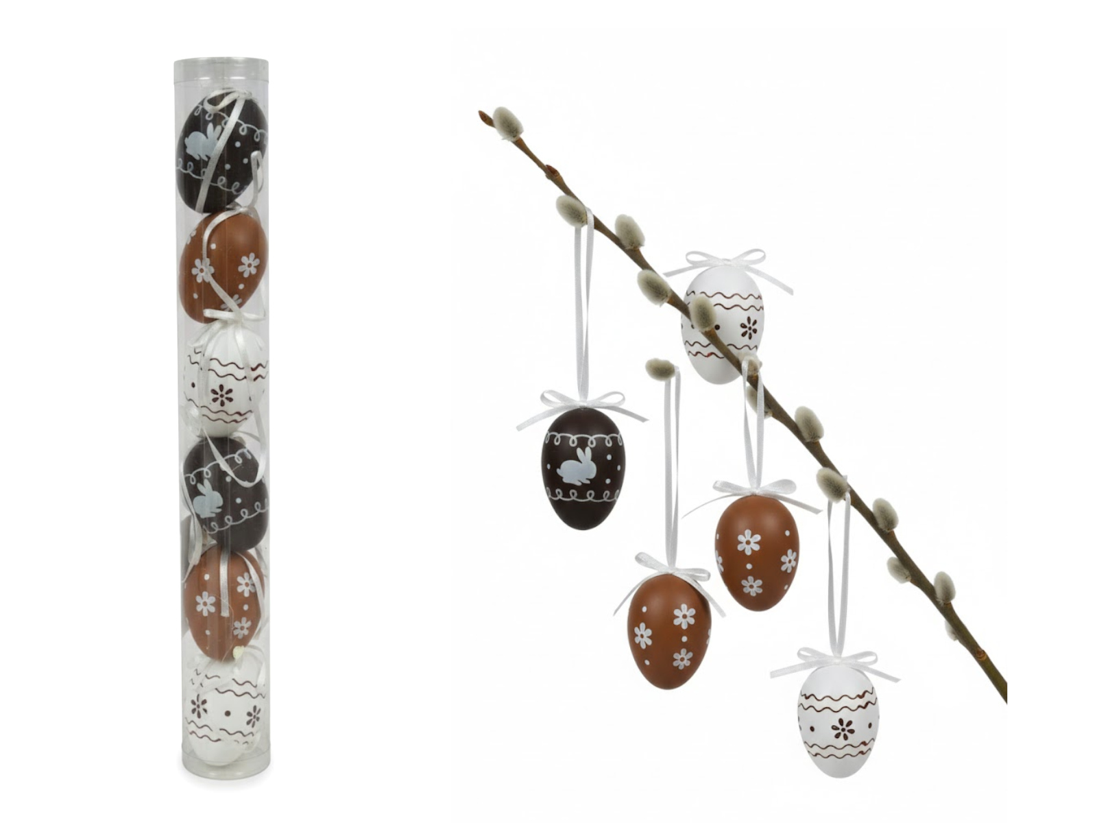 Dekoracja zawieszka wielkanocna JAJKO 6 cm  w tubie białe, beżowe, brązowe KWIATKI ZAJĄCZKI kpl. 6 szt