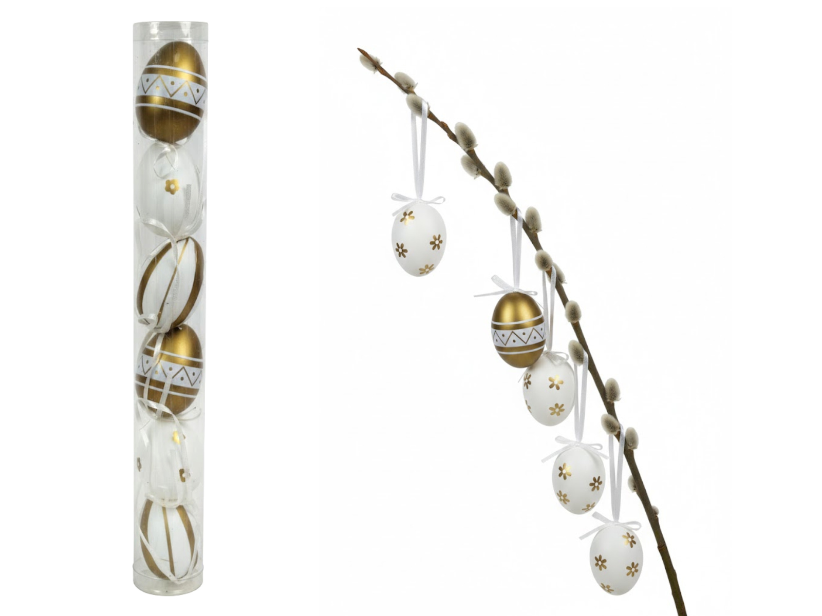 Dekoracja zawieszka wielkanocna JAJKO 6 cm w tubie białe ZŁOTY WZÓR kpl. 6 szt