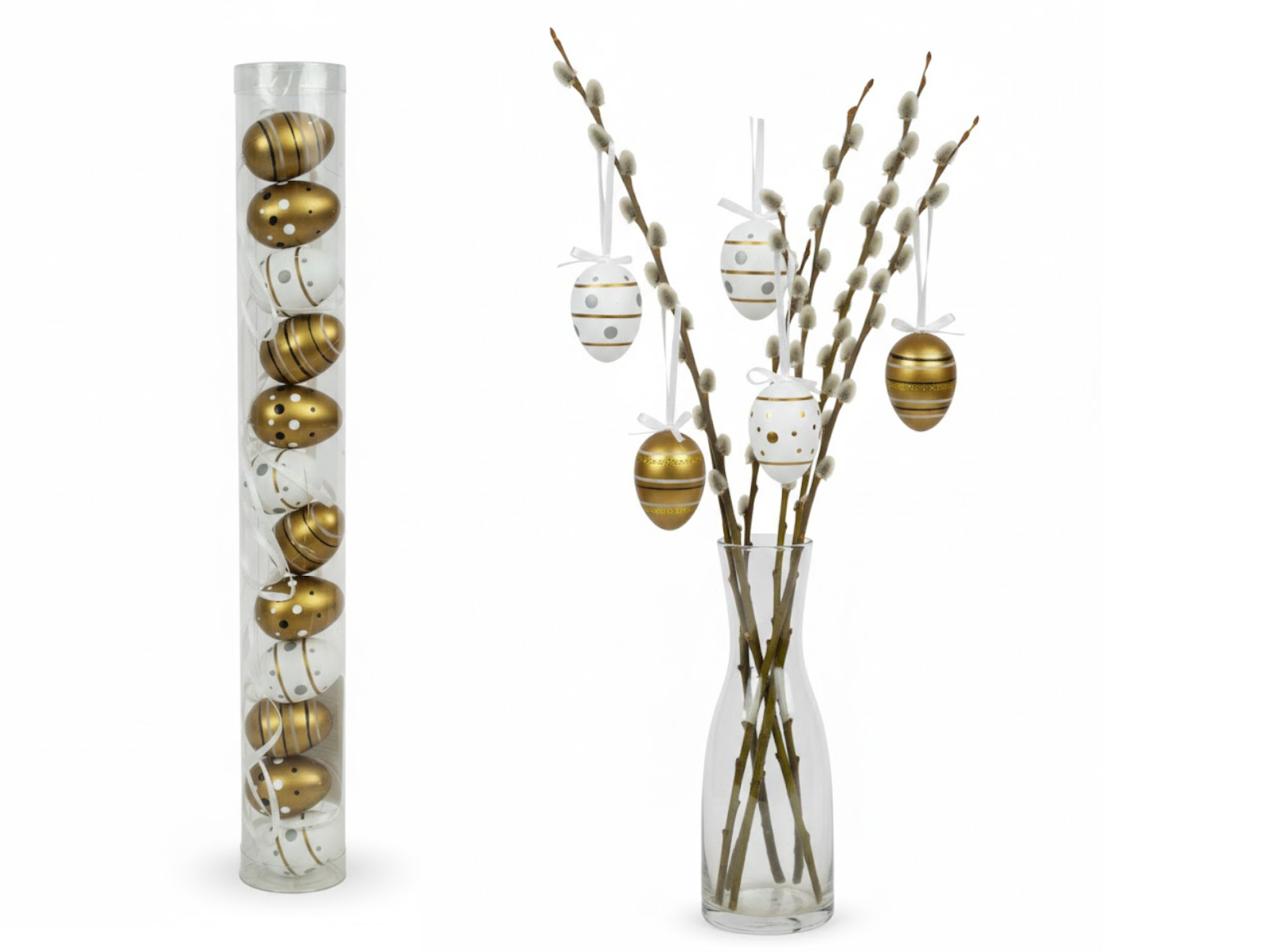 Dekoracja zawieszka wielkanocna JAJKO 4 cm w tubie białe, złote PASKI KROPKI kpl. 12 szt