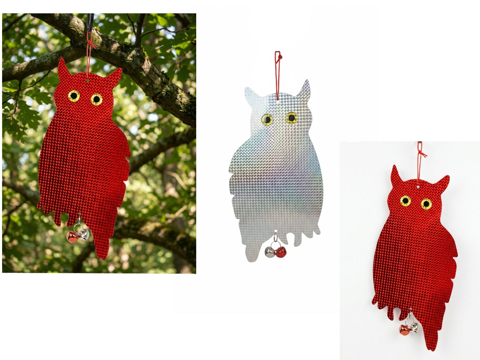 Zawieszka wietrzna, plastikowa SOWA, odstraszacz PTAKÓW z dzwoneczkami 43x20x0,01 cm HOLOGRAFICZNY srebrno-czerwony