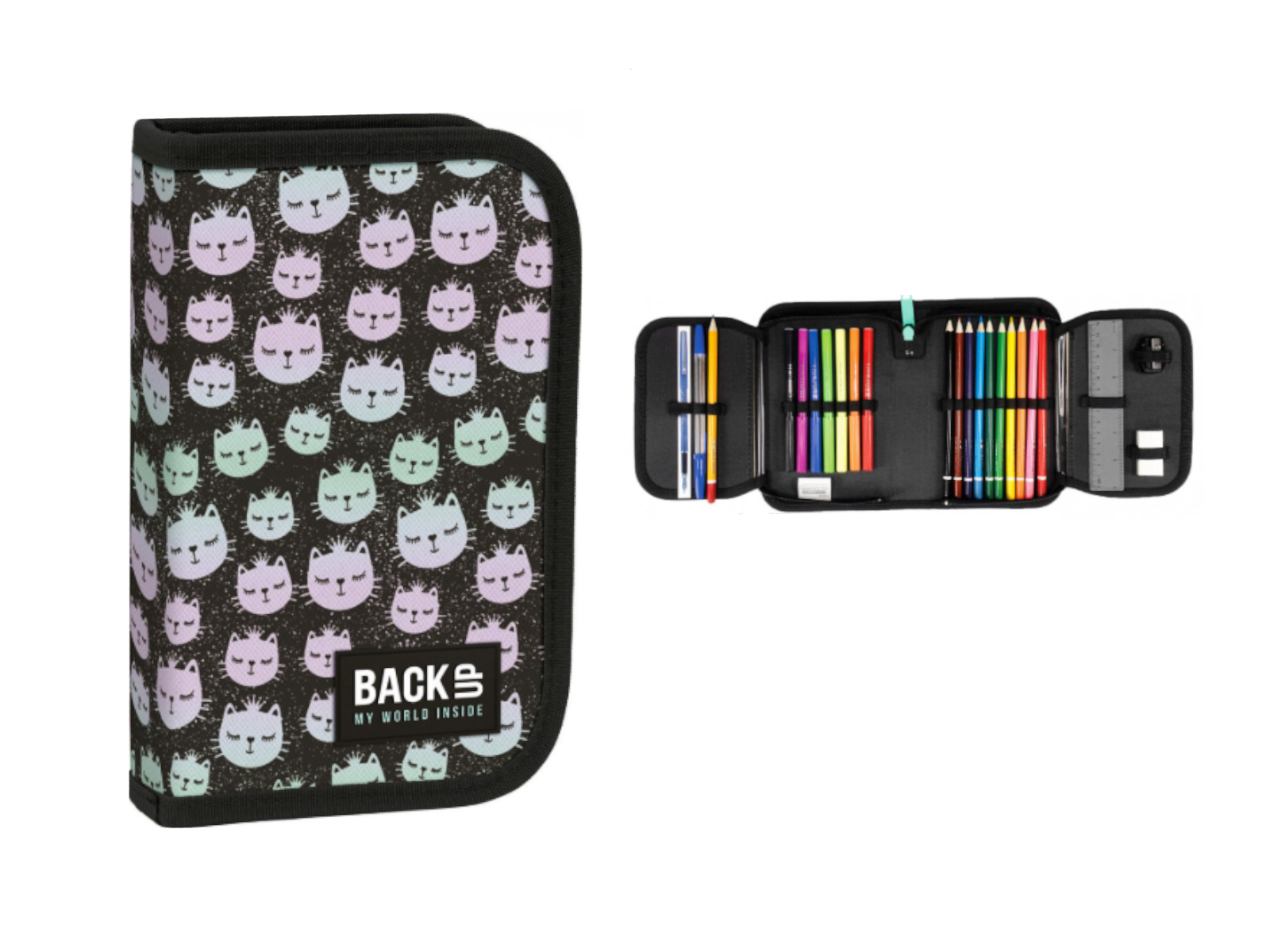 ct Piórnik z wyposażeniem podwójny 20x13x4 cm BACKUP 5 MODEL DW06 czarny w kotki