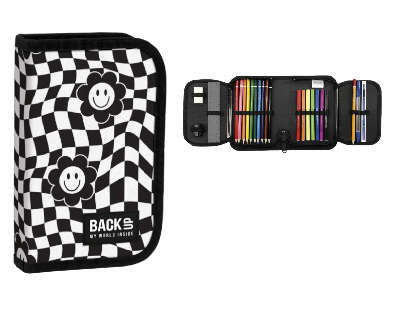 Piórnik z wyposażeniem jednokomorowy 20x13x4 cm BACKUP 6 MODEL SW14 szachownica biało-czarna