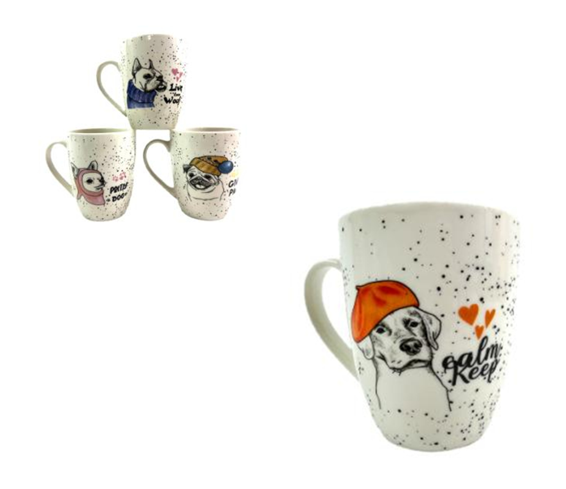 Kubek ceramiczny BIAŁY NAKRAPIANY z wzorem PIES 11x8,5x6 cm 350ml