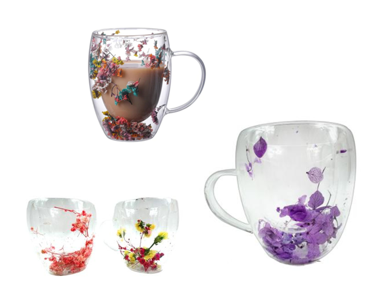 Kubek, szklanka PODWÓJNE SZKŁO z kwiatami 200 ml 9x9 cm