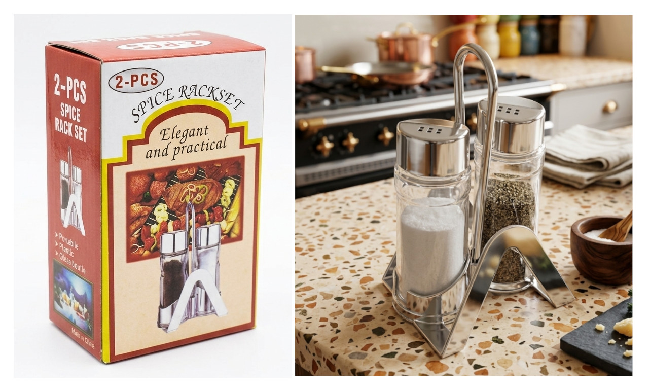 Przyprawnik, solniczka, pieprzniczka PODWÓJNA szklana z plastikową zakrętką i stojaczkiem SREBRNA 13x7x5,5 cm - 1 szt