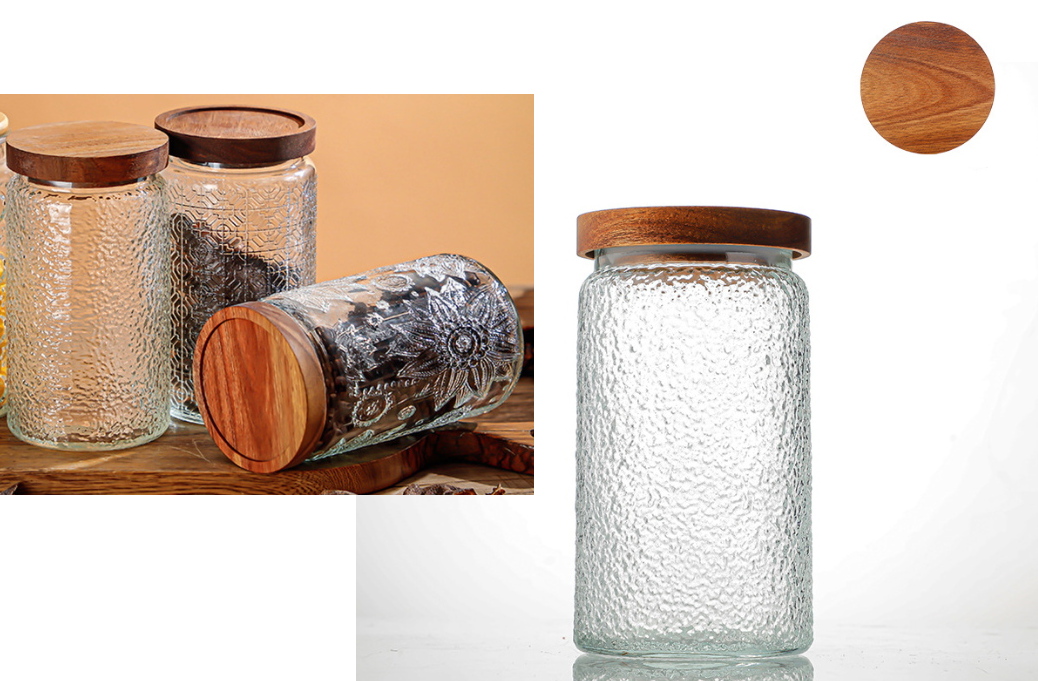 Słoik szklany z drewnianą AKACJOWĄ pokrywką 1000 ml efekt mrożonego szkła 18x10 cm